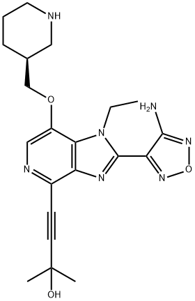 英文名稱:4-[2-(4-Amino-1,2,5-oxadiazol-3-yl)-1-ethyl-7-[(3S)-3-piperidinylmethoxy]-1H-imidazo[4,5-c]pyridin-4-yl]-2-methyl-3-butyn-2-ol CAS號:937174-76-0 分子式:C21H27N7O3 分子量:425.48