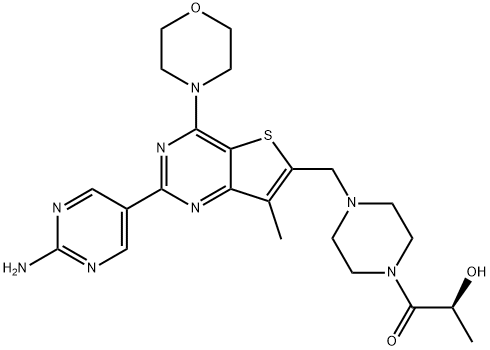 英文名稱:(S)-1-[4-[[2-(2-Aminopyrimidin-5-yl)-7-methyl-4-(morpholin-4-yl)thieno[3,2-d]pyrimidin-6-yl]methyl]piperazin-1-yl]-2-hydroxypropan-1-one CAS號(hào):1032754-93-0 分子式:C23H30N8O3S 分子量:498.6