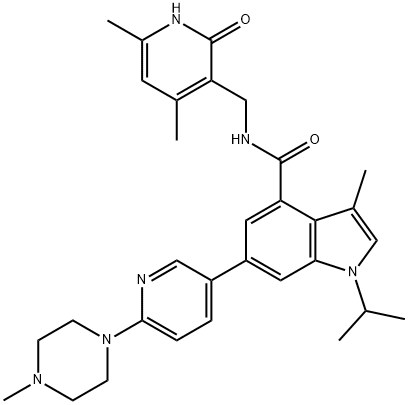 英文名稱:N-((4,6-dimethyl-2-oxo-1,2-dihydropyridin-3-yl)methyl)-1-isopropyl-3-methyl-6-(6-(4-methylpiperazin-1-yl)pyridin-3-yl)-1H-indole-4-carboxamide CAS號(hào):1346572-63-1 分子式:C31H38N6O2 分子量:526.67