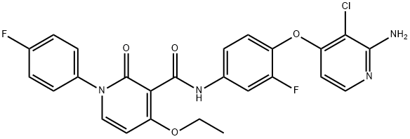 英文名稱:N-[4-[(2-Amino-3-chloropyridin-4-yl)oxy]-3-fluorophenyl]-4-ethoxy-1-(4-fluorophenyl)-2-oxo-1,2-dihydropyridine-3-carboxamide CAS號(hào):1025720-94-8 分子式:C25H19ClF2N4O4 分子量:512.89